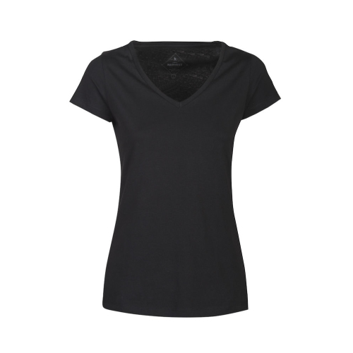 V-neck t-shirt in modern style for ladies. Slub tricot fabric made from ecologically grown cotton. 100% ecological cotton, 160 g/m2. Colors: black, white. Sizes: XS-XXL.