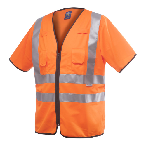 Available in three sizes. Full zip front. Two breast pockets. Material: 100% polyester. Safety class: EN471-Class 3. Colors: yellow/navy, orange/grey. Sizes: S/M, L/XL, XXL.