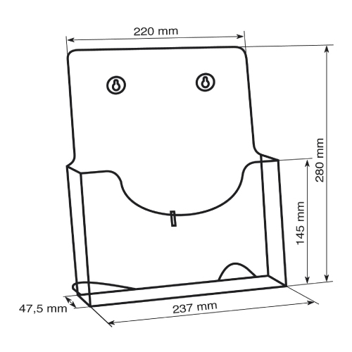 Transparent plastic leaflet dispenser, for A4P format, with holes for wall hanging. Usable base dimension: 231x42 mm.