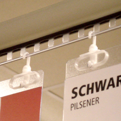 White plastic hanging hook with securing clip on the PVC pocket. The securing is reversible in holes with Ø 4 mm at a distance of 7 mm from the edge.