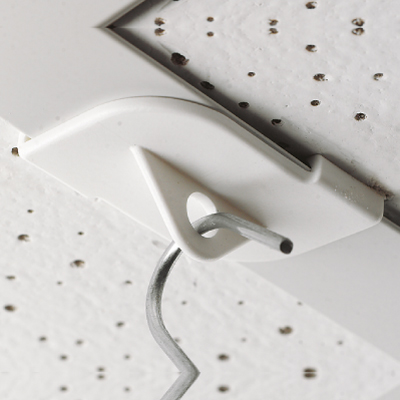 TWIST-ON plastic clip with hole, for coffered ceiling hanging. The mounting is made by snap on "T" crossbars. Colors: white.