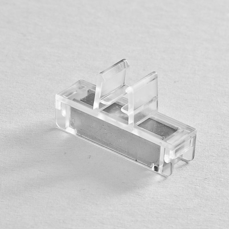 Magnetic fastener rectangular, narrow and fixed, with perpendicular display, magnetic force up to 2,8 kgs, size 45x12 mm, for series 1 frames. Colors: transparent and grey.