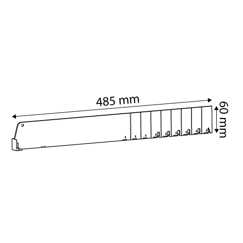 Prima S 2/60 dividers, made of clear plastic, have two attachment points, adjustable length with breaking points at each 25 mm, front "T" 20x24 mm, with a height of 60 mm, available lengths of 335 mm, 485 mm and 635 mm. To prevent a possible drop off from the shelf of products, in the upper front side, the divider has a hole through which the rod SAP 320-01 can be inserted, D 5 mm, with a length between 995 mm and 1245 mm. Divider size: 60x485 mm; available lengths after adjustment: 360, 385, 410, 435, 460 mm.