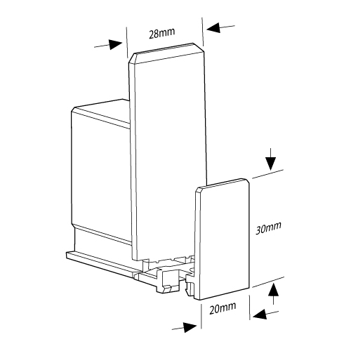 Slim pusher system made of plastic, with front stopper of 30x20 mm, width pushing plan: 28 mm. The pushing force differs depending on product weight and friction force of the pusher on the material from which is made the shelf (metal, wood, glass). Maximum recommended enlargement: 500 mm. Colors: gray. Pushing force: 4 N.