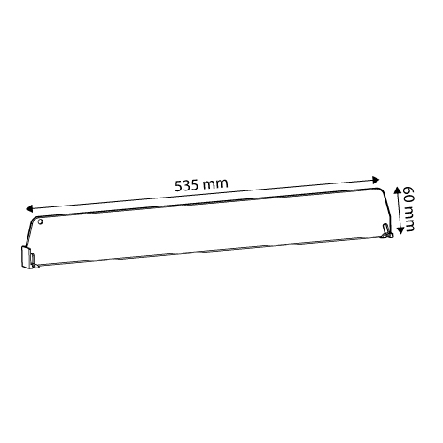 Prima S 4/60 dividers, made of clear plastic, have two attachment points, front "T" 20x24 mm, height of 60 mm, the length varies from 260 mm up to 560 mm. To prevent a possible drop off from the shelf of products, in the upper front side, at 50 mm heigth, the divider has a hole through which the rod SAP 320-01 can be inserted, D 5 mm, with a length between 995 mm and 1245 mm. Divider size: 60x535 mm.