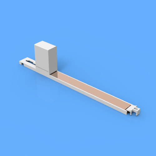 Mini pusher system made of plastic, with guide profile, pushing force 6 N, is used mainly in the case of very small products, e.g. in pharmacies. Width pushing plan: 20 mm. Available lengths: 185, 210, 235, 260, 285, 310, 335, 360 mm.