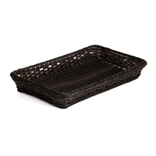 Poliratan food baskets for display bakery products. Built by dimensional GastroNorm (GN) criteria, according to EN 631 rules, with steel rectangular frame for better stability. Colors: natur, brown, brown / black.