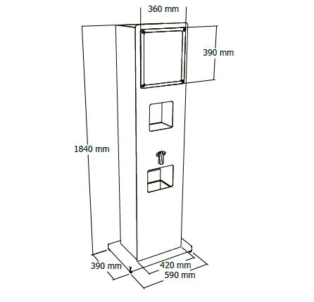 Wood structure from black chipboard 18 mm with ABS edge 0.4 mm, base from steel sheet 2 mm black RAL 9005 painted, front from black hips 3 mm, transparent PET 3 mm, 4 pcs aluminum spacers and stickers, 1 touch less dispenser for hand sanitizer, packing in bag foil and cardboard box, exw tm.