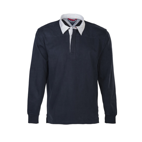 Sweater in rugby model with heavy cotton jersey and lightly brushed exterior provides a nice feeling. Collar and placket in twill with rubber buttons. Quilted pattern on the shoulder gives an exclusive look. Cuffs at sleeves and side slit with herringbone reinforcements. 100% cotton, 320 g/m2. Colors: navy. Sizes: XS-4XL.