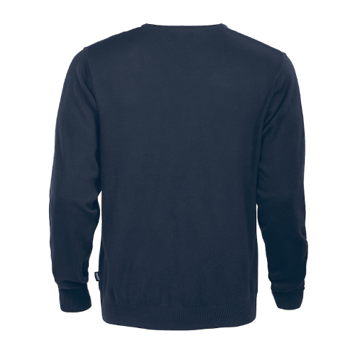 Fine-knit fully fashion V-neck sweater. 12 gg knitted. Ribbed cuffs with wefts of elastic thread in sleeves and bottom. 100% cotton. Colors: navy, black. Sizes: S-3XL.
