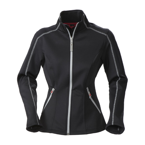Ladies micro fleece jacket, outside not brushed. Contrast zippers and over lock seams. 94% polyester and 6% spandex. Colors: black, white, navy. Sizes: XS-XXL.
