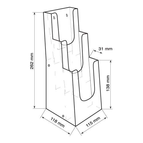 Transparent plastic leaflet dispenser holder with 3 tiers, for 1/3 A4P format, usable depth of each tier being of 31 mm. It can be counter or wall exposed, being provided with fastening side holes. Usable base dimension: 107 x 31 mm.