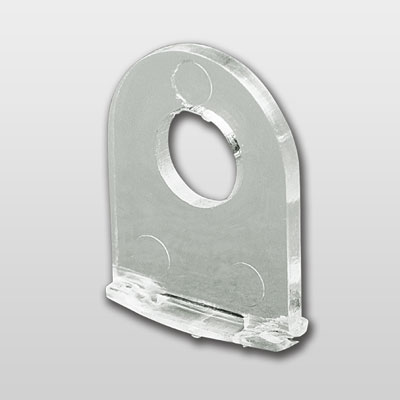 Plastic hanging clip for LPE 015-421 profile hanging. Clip size: 15x20 mm (LxH), 6.5 mm Ø hole. Colors: transparent.