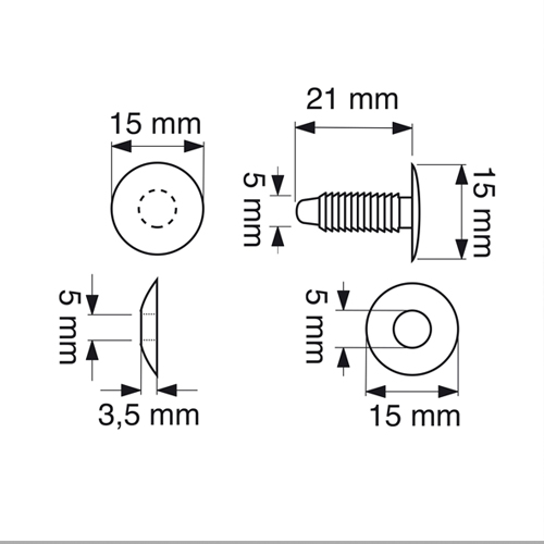 Outer ends Ø 15 mm and the thread Ø 5 mm. Curved button head. For materials with maximum thickness of 15 mm.