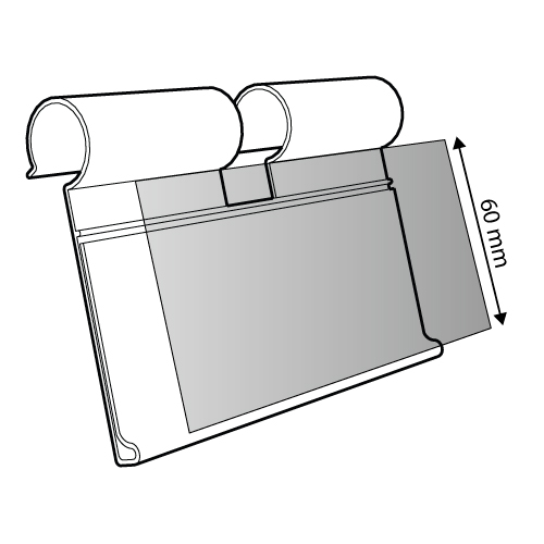 Label holder for wire T hook with a maximum diameter of 6 mm. Available lengths from 40 to 70 mm. Transparent pocket reflected on front.