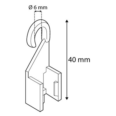 Hanging hook for series 1 frames, with fixed hook of 40 mm length, with fixing on Ø maximum 6 mm. Colors: transparent.
