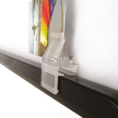 Promotion card clip to fix additional prints in a standing or hanging position. Colors: transparent.