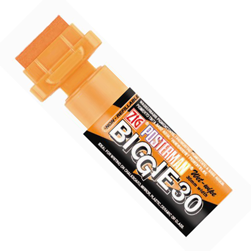 Wet-wipe Posterman marker based on chalk dust, various thicknesses, is used for writing on non-porous surfaces such as paper, plastic, fabric, wood, glass, metal and polystyrene. What is remarkable for this type of marker is that it can be removed easily with a damp cloth and used in stores for indoor advertising, in flower shops, bars, pubs and restaurants. Before each use, the ink is homogenized by stirring the marker and the tip is loaded by repeatedly pressings in. On request you can order other colors from color chart attached.