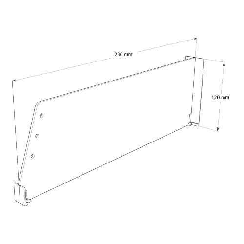Prima 1/120 dividers, made of clear plastic, have a single point of attachment, height of 120 mm and the length varies from 180 mm in increments of 25 mm up to 555 mm in length. To prevent a possible drop off from the shelf of products, in the front, at a height of 50 mm, 75 mm, 100 mm, they are provided with three holes through which the rod SAP 320-01 can be inserted, D 5 mm, with a length between 995 mm and 1245 mm. The height at which the rod can be mounted is chosen according to the product height on the shelf. Divider size: 120x230 mm.