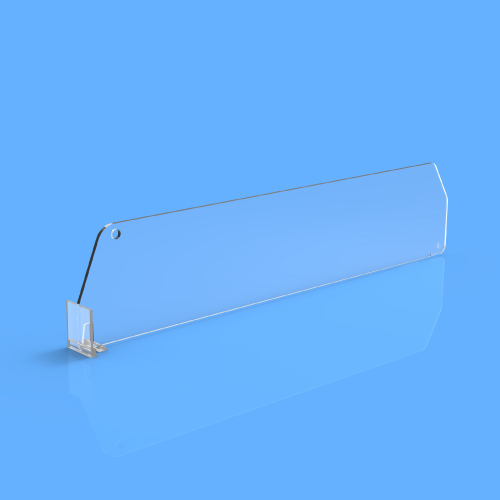 Prima S 1/60 dividers, made of clear plastic, have a single attachment point, front "T" 20x24 mm, height of 60 mm, and their length varies from 180 mm up to 555 mm. To prevent a possible drop off from the shelf of products, in the upper front side, at a height of 50 mm, the divider has a hole through which the rod SAP 320-01 can be inserted, D 5 mm, with a length between 995 mm and 1245 mm. Divider size: 60x355 mm