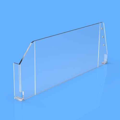 Prima S 3/120 divider, made of clear plastic, have two attachment points, front "L" 17x80 mm on the left side and front "T" 20x24 mm in the back, with a height of 120 mm, the length varies from 335 mm up to 585 mm. To prevent drop off of products on the shelf, these dividers are provided with three holes at a height of 50, 75, 100 mm, located at the back, allowing the use of SAP 320-01 rod, D 5 mm, with a length between 995 mm and 1245 mm. Divider size: 120x335 mm.