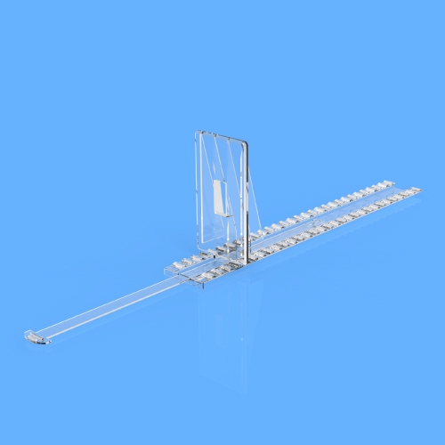 Manual pusher system, clear plastic, consisting of three parts: the ladder, holder and rod. It is recommended for thin products wanted to be displayed in a slightly inclined position and where a pusher is often too weak to effectively push or too strong and the products are damaged. The ladder is fixed on the snap on rail and the rod which slides inside the scale operated by pulling brings to the front of the shelf the holder of products that will evolve in stages. The products on the shelf will always be visible. Scale width: 50 mm, dimensions 120x65 mm arm. Length 465 mm, for shelves with 485 mm depth.