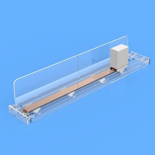Plastic merchandising system with pusher of 18x40 mm (WxH) with pushing force of 2 N, divider with 40 mm height, sliding rail with 45 mm width slightly raised at the ends so that the products be more accessible. It is ideal for small and light products such as cigarettes, drugs, spices, etc. Symmetry of product allows fixing the pusher at both ends, with the possibility of changing the location of divider from the left side on the right side. It can thus easily and quickly create shelves with neat, tidy and easy to move aspect. The available lengths for this product are various and suitable for shelf depths between 235-400 mm. Gray pusher with transparent rail. Slide rail length: 260 mm.