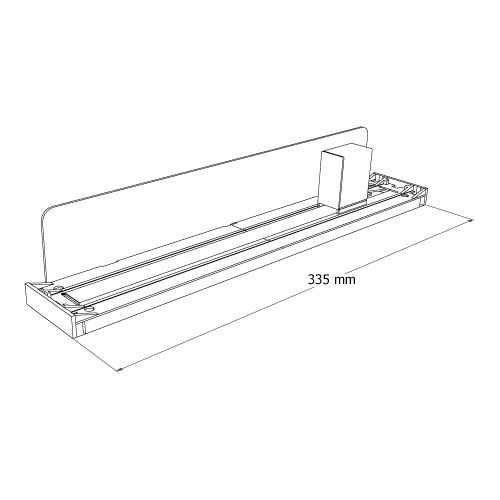 Plastic merchandising system with pusher of 18x40 mm (WxH) with pushing force of 2 N, divider with 40 mm height, sliding rail with 45 mm width slightly raised at the ends so that the products be more accessible. It is ideal for small and light products such as cigarettes, drugs, spices, etc. Symmetry of product allows fixing the pusher at both ends, with the possibility of changing the location of divider from the left side on the right side. It can thus easily and quickly create shelves with neat, tidy and easy to move aspect. The available lengths for this product are various and suitable for shelf depths between 235-400 mm. Gray pusher with transparent rail. Slide rail length: 335 mm.