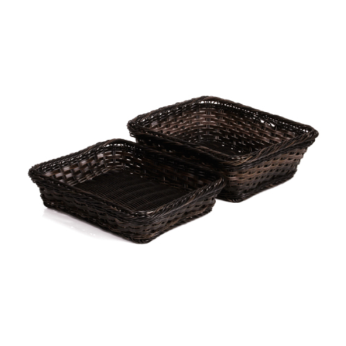 Poliratan food baskets for display bakery products. Built by dimensional GastroNorm (GN) criteria, according to EN 631 rules, with steel rectangular frame for better stability. Colors: natur, brown, brown / black.